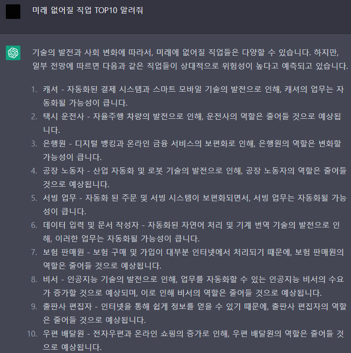 3. 은행원 - 디지털 뱅킹과 온라인 금융 서비스의 보편화로 인해, 은행원의 역할은 변화할 가능성이 큽니다.
